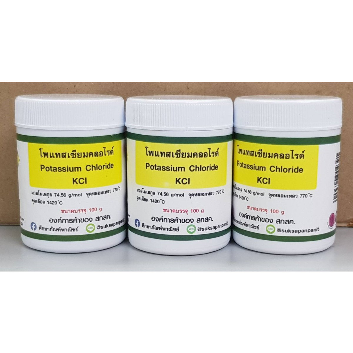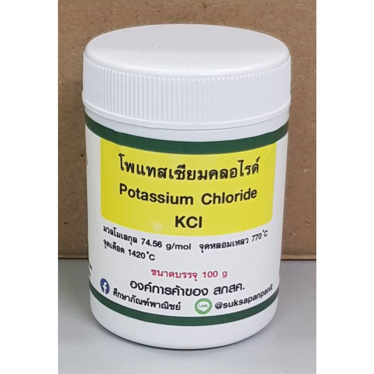 ขนาดบรรจุ : 100 CCสูตรเคมี : KClมวลโมเลกุล : 74.56 g/mol จุดวาปไฟ : จุดหลอมเหลว : 770 °Cจุดเดือด : 1420 °Cวันที่ผลิต :