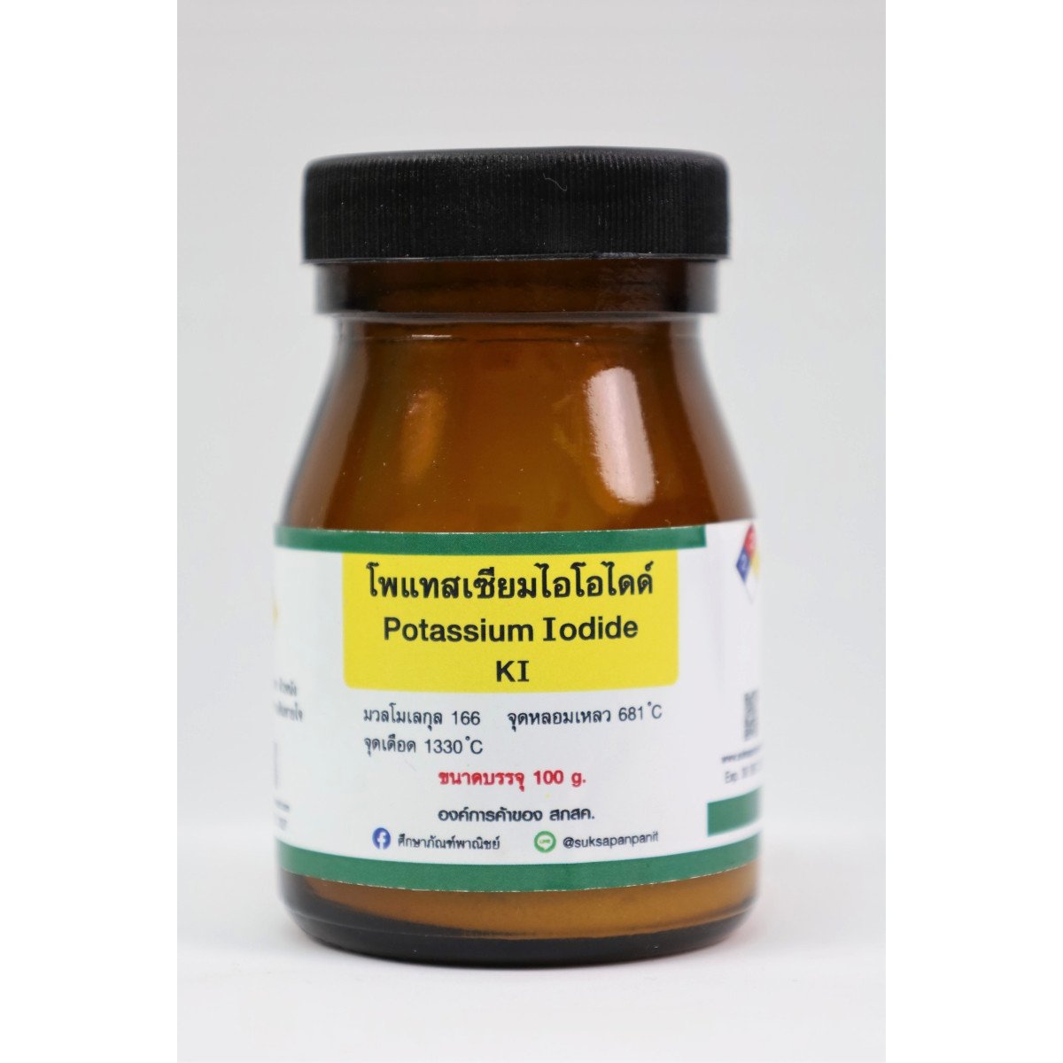 ชื่อสินค้า : โพแทสเซียมไอโอไดด์ 100 g. : Potassium Iodideขนาดบรรจุ : 100 gสูตรเคมี : KIมวลโมเลกุล : 166 g/molจุดหลอมเหลว :681 Cจุดเดือด : 1330 Cคำเตือน : ระคายเคืองตา ผิวหนัง และระบบทางเดินหายใจ