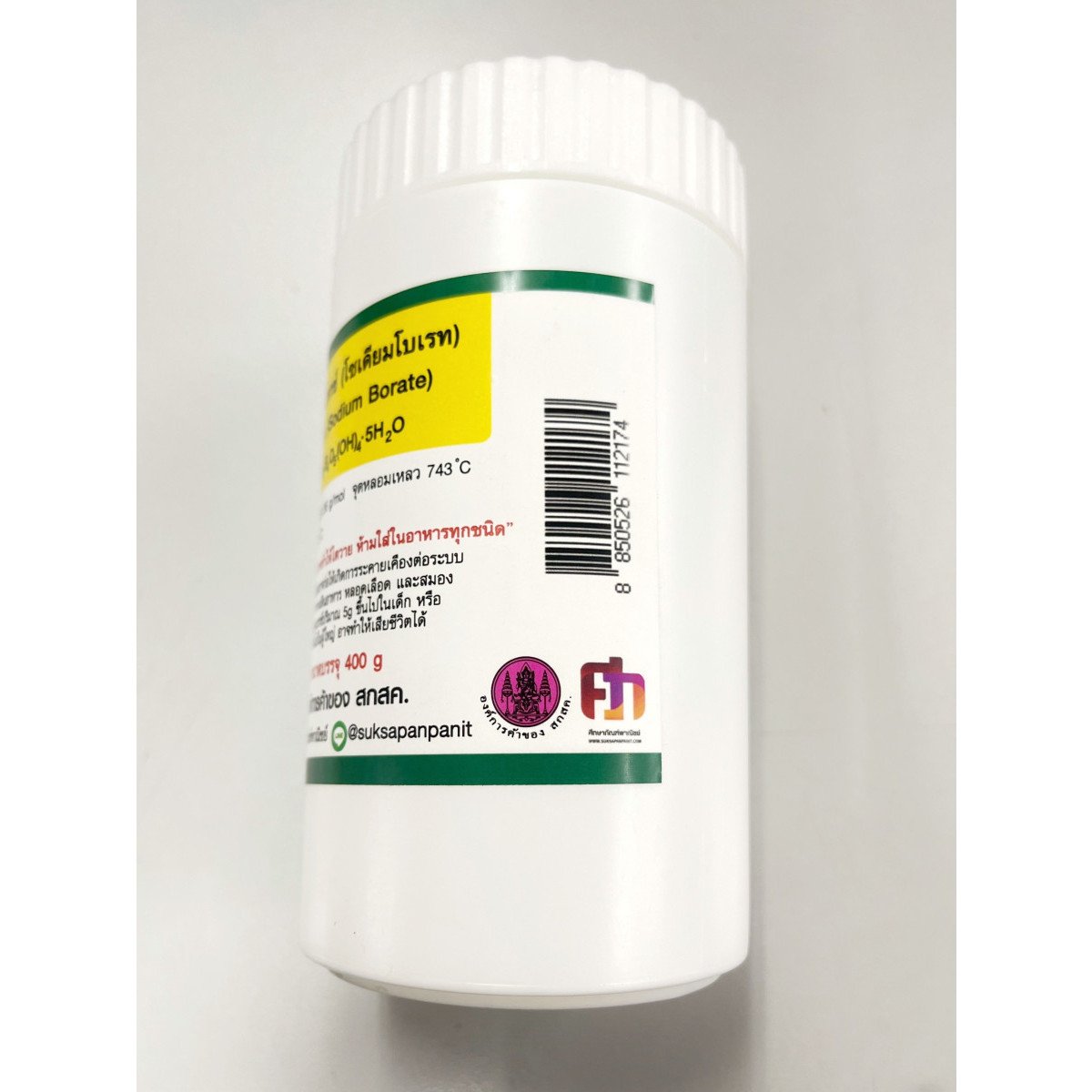 ขนาดบรรจุ : 400 gสูตรเคมี : Na₂B₄O₅(OH)₄·5H₂Oมวลโมเลกุล : 381.36 g/mol จุดวาปไฟ : จุดหลอมเหลว : 743 °Cจุดเดือด : 1,575 °Cคุณสมบัติ : ใช้เป็นสารฆ่ามด ใช้ในอุตสาหกรรมเคลือบเงา อีนาเมล สารทำความสะอาดและบัดกรีโลหะคำเตือน : "อันตราย อาจทำให้ไตวาย ห้ามใส่ในอาหารทุกชนิด"