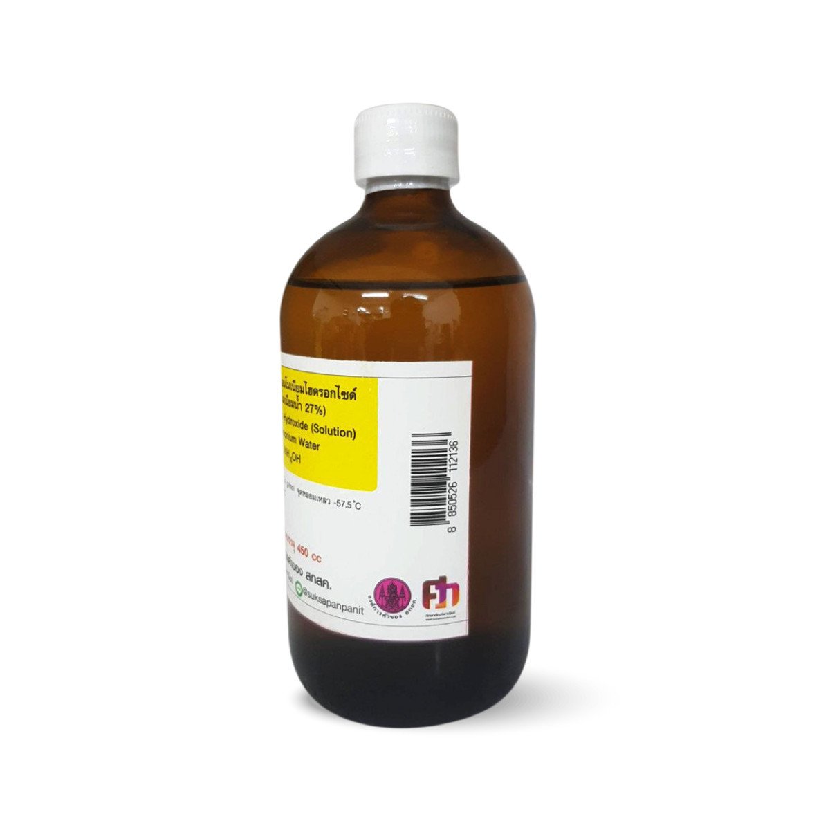 ขนาดบรรจุ : 450 CCสูตรเคมี : NH4OHมวลโมเลกุล : 35.10 g/mol จุดวาปไฟ : จุดหลอมเหลว : -57.5 °Cจุดเดือด : 37.7 °Cคุณสมบัติ : เป็นของเหลวไม่มีสี มีกลิ่นฉุน การนำไปใช้ ใช้ในการทำอุตสาหกรรมยาง ใช้เป็นส่วนประกอบในน้ำยาทำความสะอาด ผลิตยา