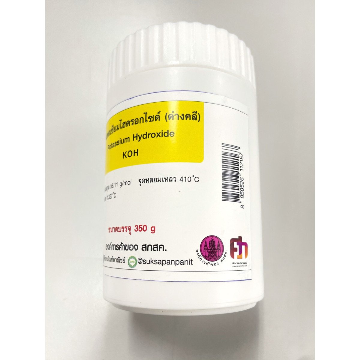 ขนาดบรรจุ : 350 gสูตรเคมี : KOHมวลโมเลกุล : 56.11 g/mol จุดวาปไฟ : จุดหลอมเหลว : 410 °Cจุดเดือด : 1,327 °Cคุณสมบัติ : เป็นสารประกอบทางเคมีที่ได้รับความนิยมอย่างมหาศาลในฐานะส่วนผสมที่จำเป็นสำหรับการผลิตสารทำความสะอาด สบู่ หรือแบตเตอรี่