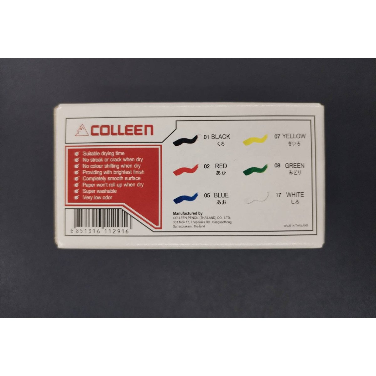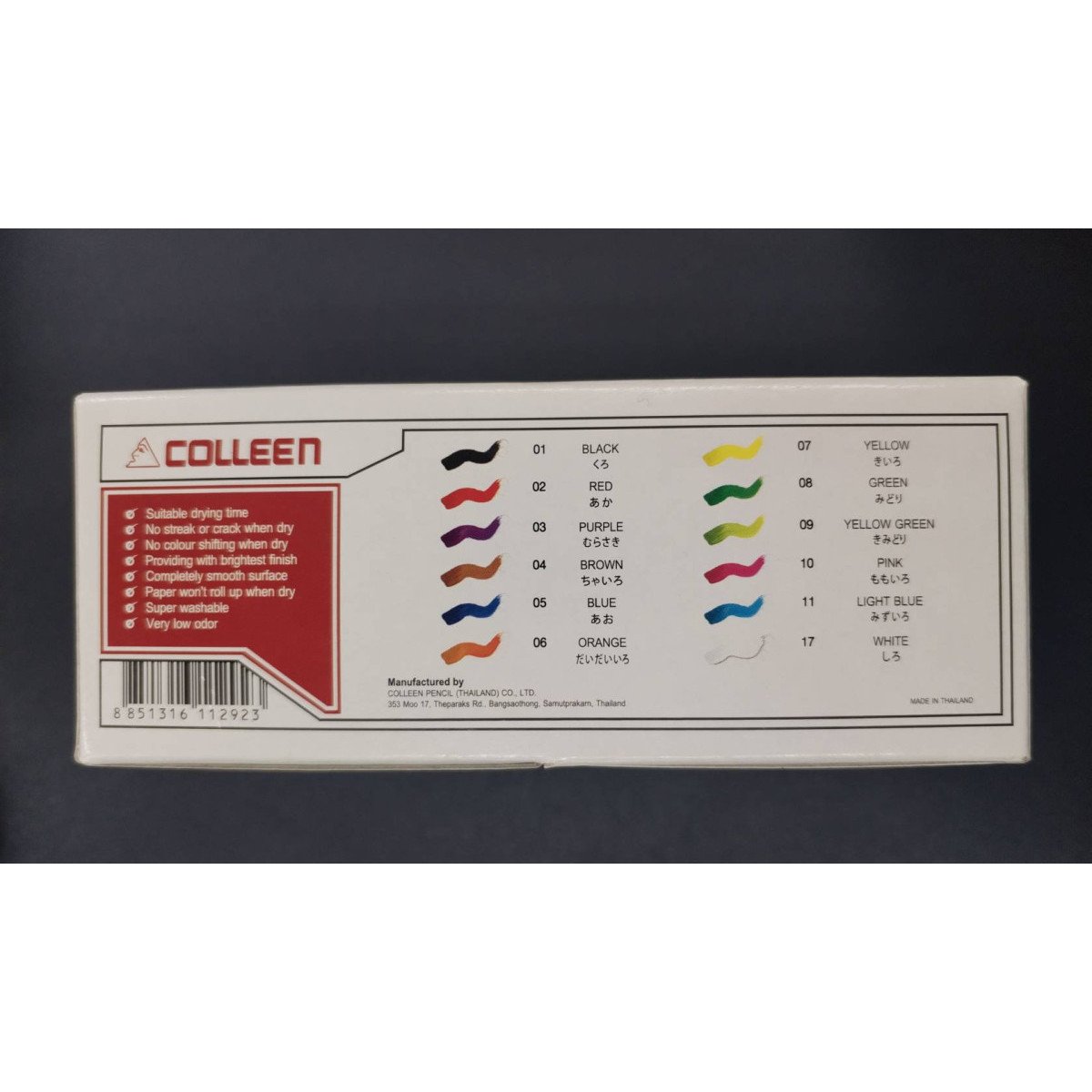 - เนื้อสีละเอียด ให้สีสวยสด ไม่จับกันเป็นก้อน- สีคุณภาพใช้สร้างสรรค์ผลงานศิลปะได้หลากหลาย- สามารถระบายได้กับวัสดุหลายพื้นผิว หิน พลาสติก ไม้ กระดาษ ฯลฯ- ฝาขวดออกแบบพิเศษสามารถที่เป็นวางพู่กันได้ ฝาขวดปิดล็อคสนิท สามารถเก็บไว้ได้นาน- สีปลอดภัย ไร้สารพิษ NON-TOXIC มาตราฐาน EN71/3&9- Japanese Quality and Technology- ขนาด 12 ml.- ชุด 6 สี ประกอบไปด้วยสี - สีดำ - สีแดง - สีฟ้า - สีเหลือง - สีเขียว - สีขาว- ชุด 12 สี ประกอบไปด้วยสี - สีดำ - สีแดง - สีม่วง - สีน้ำตาล - สีฟ้า - สีส้ม - สีเหลือง - สีเขียว - สีเขียวเหลือง - สีชมพู - สีฟ้าอ่อน - สีขาว