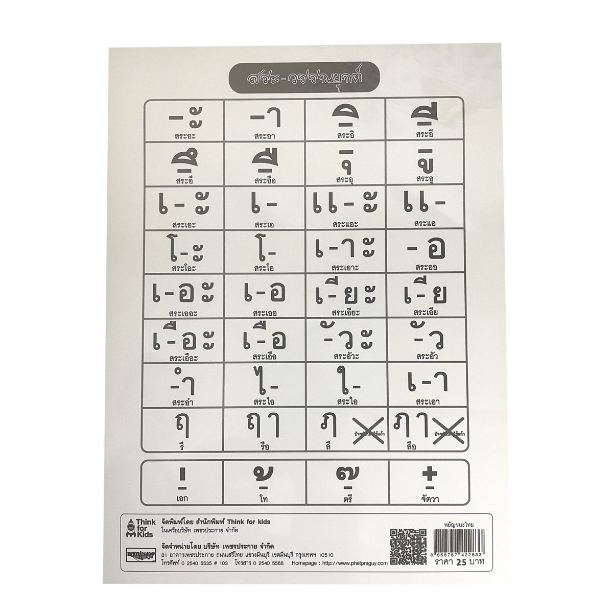 โปสเตอร์พยัญชนะไทย 44 ตัว ด้านหน้า เป็นพยัญชนะไทย ก.ไก่-ฮ.นกฮูก ด้านหลัง เป็นสระ และวรรณยุกต์ ส่งเสริมทักษะทางด้านภาษาไทย ฝึกการหัดอ่าน
