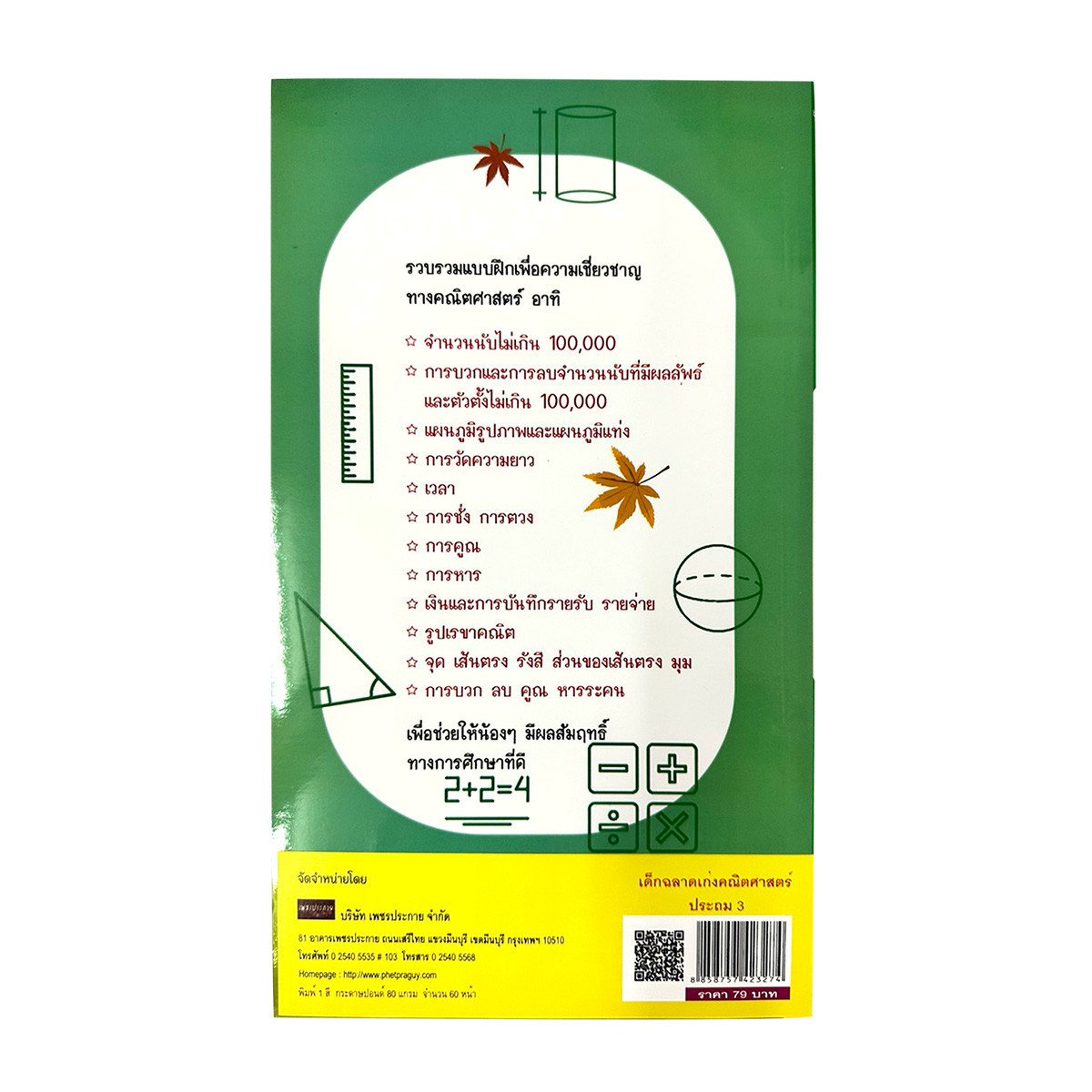 เพิ่มพูนทักษะทางคณิตศาสตร์ให้กับน้องๆ ระดับชั้นประถมศึกษาปีที่ 3 ด้วยแบบฝึกหัดที่หลากหลาย อาทิ จำนวนนับไม่เกิน 100,000 , การบวกและการลบจำนวนนับที่มีผลลัพธ์และตัวตั้งไม่เกิน 100,000 , แผนภูมิรูปภาพและแผนภูมิแท่ง , การวัดความยาว , เวลา , การชั่ง การตวง , การคูณ , การหาร , เงินและการบันทึกรายรับ รายจ่าย , รูปเรขาคณิต, จุด เส้นตรง รังสี ส่วนของเส้นตรง มุม , การบวก ลบ คูณ หารระคน เพื่อช่วยให้น้องๆ เรียนดี สอบได้ มีผลสัมฤทธิ์ทางการศึกษาที่ดี