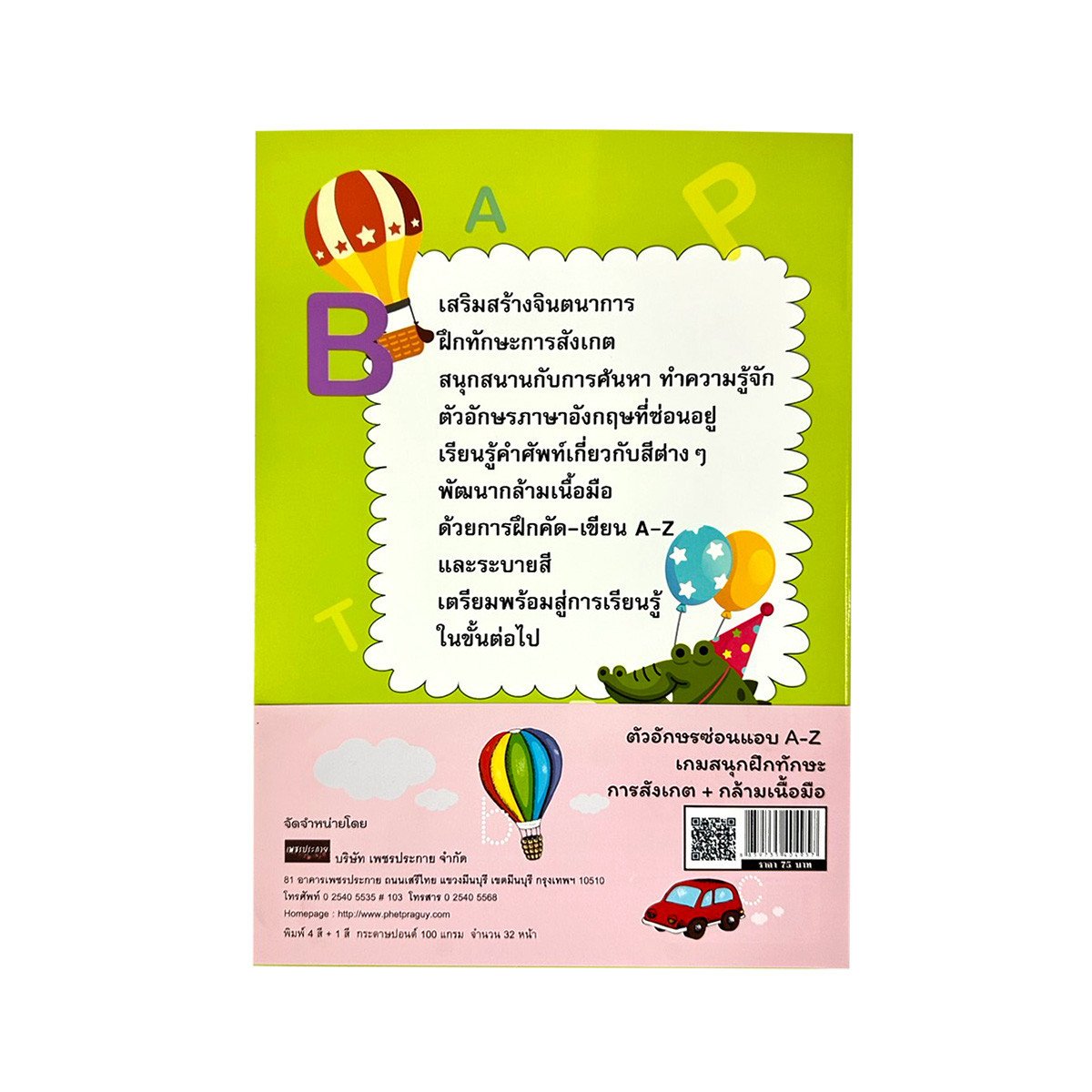 เสริมสร้างจินตนาการ ฝึกทักษะการสังเกต สนุกสนานกับการค้นหา ทำความรู้จักตัวอักษรภาษาอังกฤษที่ซ่อนอยู่ เรียนรู้คำศัพท์เกี่ยวกับสีต่างๆ พัฒนากล้ามเนื้อมือ ด้วยการฝึกคัด-เขียน A-Z และระบายสี เตรียมพร้อมสู่การเรียนรู้ในขั้นต่อไป
