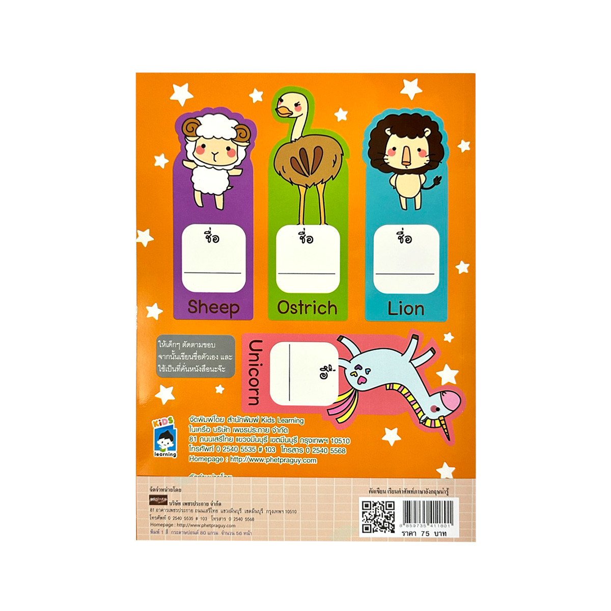 "คัดเขียน เรียนคำศัพท์ภาษาอังกฤษน่ารู้" เล่มนี้ จะชวนเด็ก ๆ มาหัดคัด หัดเขียน เรียนคำศัพท์ภาษาอังกฤษ ที่ครบทั้งเรื่องการคัดตัวอักษรพิมพ์ใหญ่และพิมพ์เล็ก พร้อมด้วยศัพท์ตามหมวดตัวอักษรซึ่งเป็นคำศัพท์ที่ใกล้ตัวเด็ก ๆ และภาพประกอบน่ารัก นอกจากนี้ยังมีกิจกรรมทบทวนเพื่อช่วยให้เด็ก ๆ สามารถเข้าใจและจดจำภาษาอังกฤษได้ง่ายขึ้น
