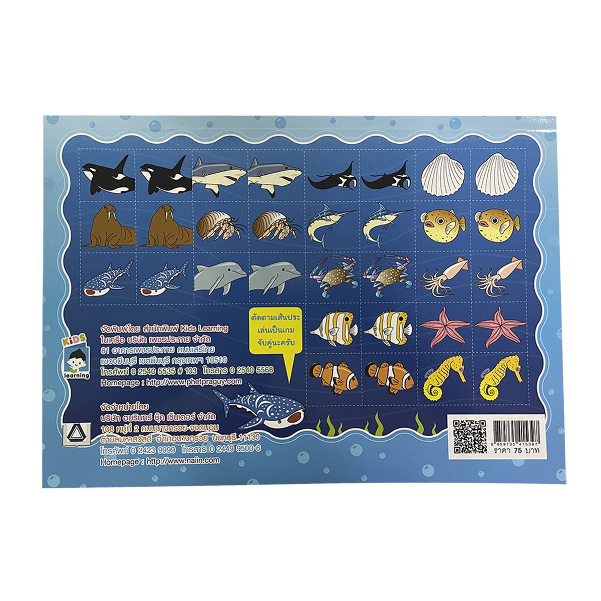 กิจกรรมลากเส้นต่อจุดสัตว์ทะเลน่ารู้ ภายในเล่มรวบรวมสัตว์ทะเลหลากหลายชนิดเอาไว้ในเล่มเดียว พร้อมข้อมูลที่จะช่วยเสริมความรู้ให้เด็กๆ ระกว่างทำกิจกรรมลากเส้นต่อจุดและระบายสีในส่วนท้ายจะเป็นกิจกรรมเสริมให้เด็กๆ อีกด้วย