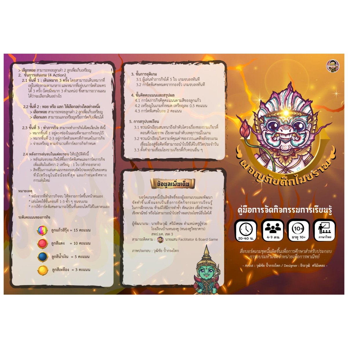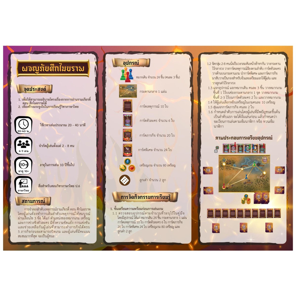 เรียนรู้เรื่องราวของรามเกียรติ์ ตอน ศึกไมยราพ ซึ่งเป็นวรรณคดีไทย เรื่องรามเกียรติ์ ตอนศึกไมยราพ ผู้เล่นสวมบทบาทเป็นบุคคลที่จะเข้าไป ทำให้เหตุการณ์ของวรรณคดีมีความสมบูรณ์ โดยดำเนินเรื่องตามเส้นทางของตัวละครในวรรณคดี ผู้เล่นที่สามารถทำได้ 7 ภารกิจก่อน จะเป็นผู้ชนะในเกมทันที แนวเกม– พิชิตภารกิจ– จำลองสถานการณ์– การศึกษากลุ่มสาระวิชา : ภาษาไทย/วรรณคดีไทยคู่มือ ภาษาไทยอายุ : 12 ปีขึ้นไปผู้เล่น: 2 - 5 คนใช้เวลาเล่น: 20 - 40 นาที