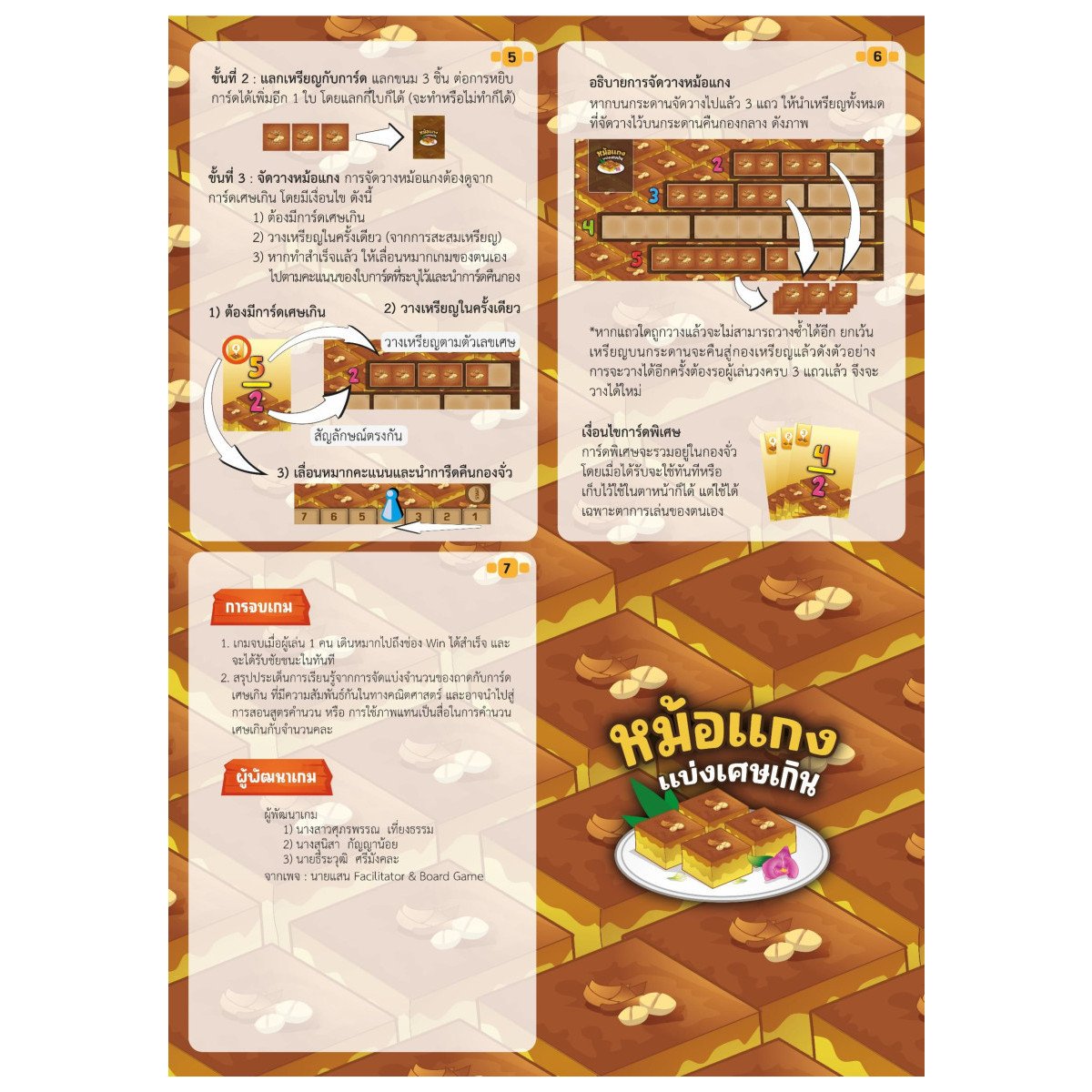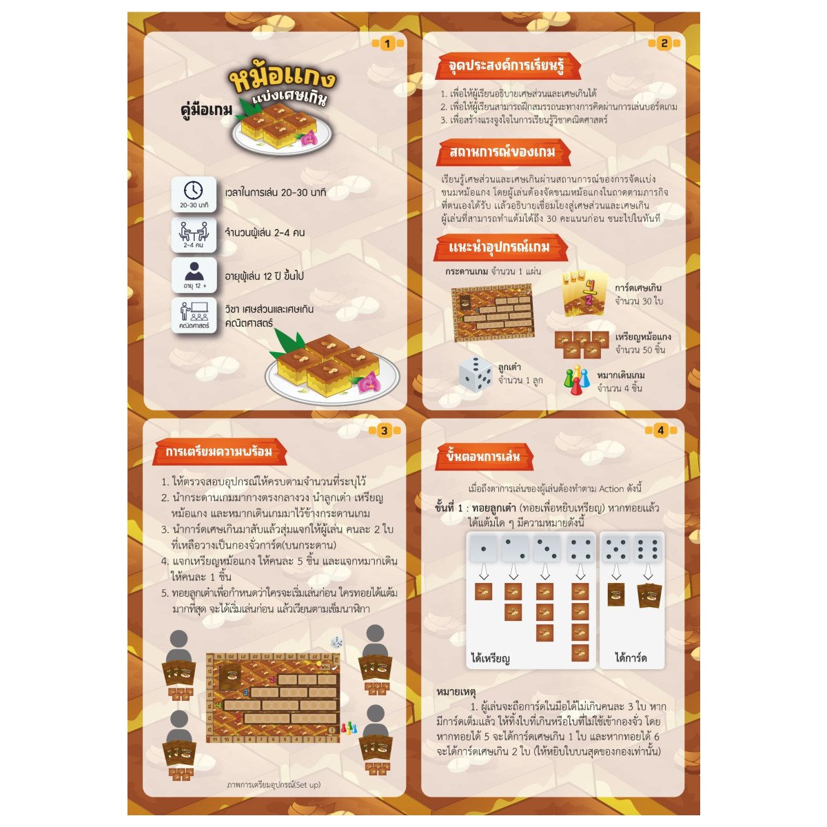 เรียนรู้เศษส่วนและเศษเกินผ่านสถานการณ์ของการจัดเเบ่งขนมหม้อแกง โดยผู้เล่นต้องจัดขนมหม้อแกงในถาดตามภารกิจที่ตนเองได้รับ เเล้วอธิบายเชื่อมโยงสู่เศษส่วนและเศษเกินผู้เล่นที่สามารถทำแต้มได้ถึง 30 คะแนนก่อน ชนะไปในทันที