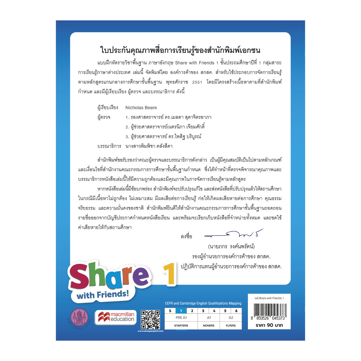 Share with Friends คือชุดหนังสือที่ตอบโจทย์โรงเรียนที่มุ่งมั่นยกระดับคุณภาพการเรียนการสอนภาษาอังกฤษได้จริง ✅ หลักสูตรภาษาอังกฤษระดับประถม✅ ออกแบบบนมาตรฐาน CEFR ✅ สอดคล้องกับ ตัวชี้วัด สพฐ. ครบ✅ เด็กเรียนรู้ได้จริง ✅ ครูสอนง่าย สามารถประเมินผลได้ตามมาตรฐานสากลLearning Pack - Share with Friends!ประกอบด้วยสื่อหลัก 3 ประเภทสำหรับการจัดการเรียนการสอนอย่างเป็นระบบ ได้แก่✔ Student Book – ปูพื้นฐานภาษาอังกฤษอย่างเป็นระบบ✔ Workbook – แบบฝึกหัดเสริมความเข้าใจตามลำดับทักษะ✔ Sharebook – กิจกรรมฝึกการสื่อสาร (Speaking Activities) ที่นำไปใช้ในห้องเรียนได้จริงเหมาะสำหรับโรงเรียนที่กำลังมองหาหลักสูตรคุณภาพ ที่ช่วยให้ทั้งครูและเด็กสอน–เรียนได้อย่างมั่นใจ