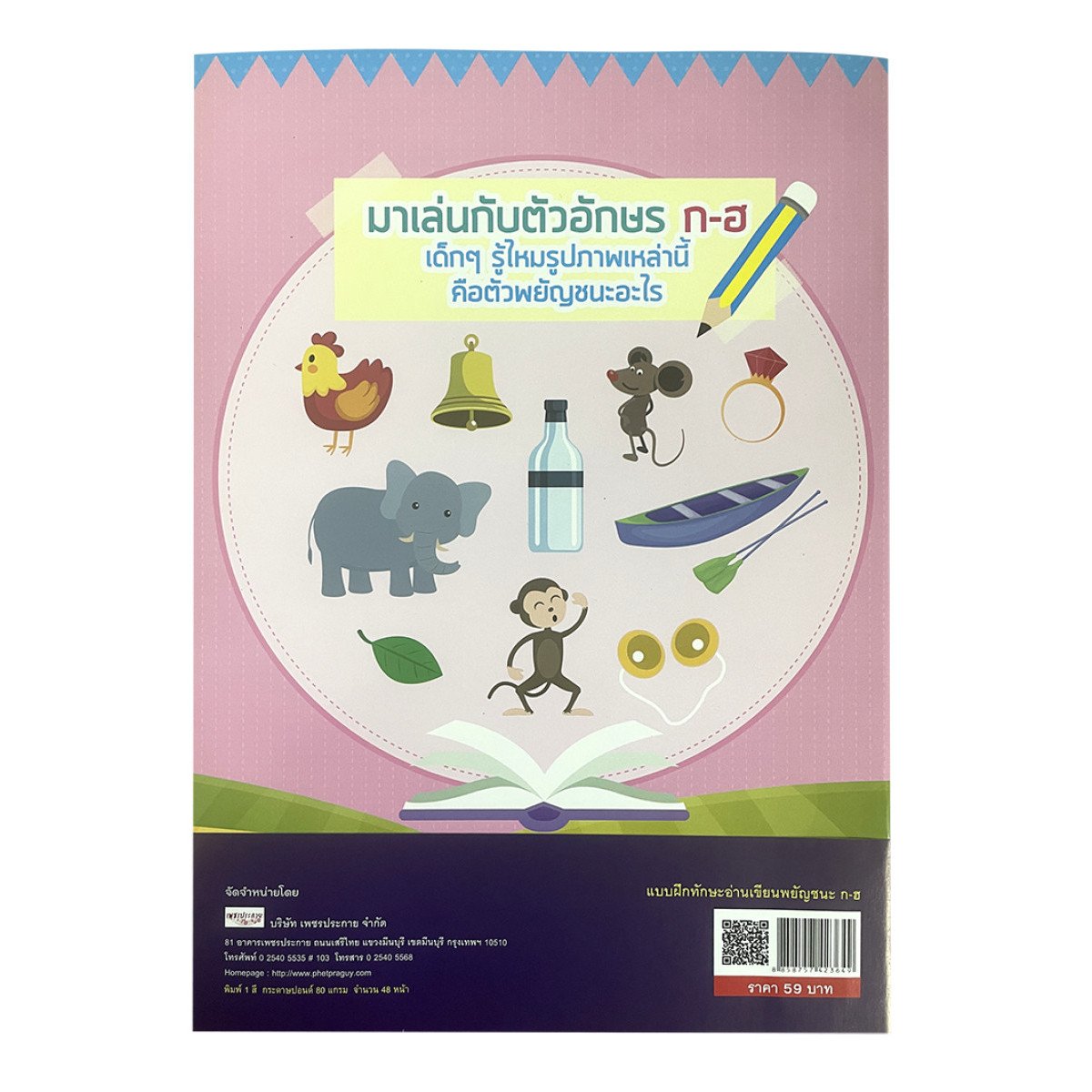 ฝึกทักษะพื้นฐานอ่านเขียน ก-ฮ เหมาะสำหรับ พ่อ แม่ ครู ใช้เป็นคู่มือปลูกฝังให้เด็กฝึกคัดเด็กคัด ก-ฮ อย่างสนุกสนานเหมือนการสร้างงานศิลปะ อีกทั้งยังมีแบบฝึกหัดอ่านคำคล้องจอง และอักษรสัมผัสอีกด้วย