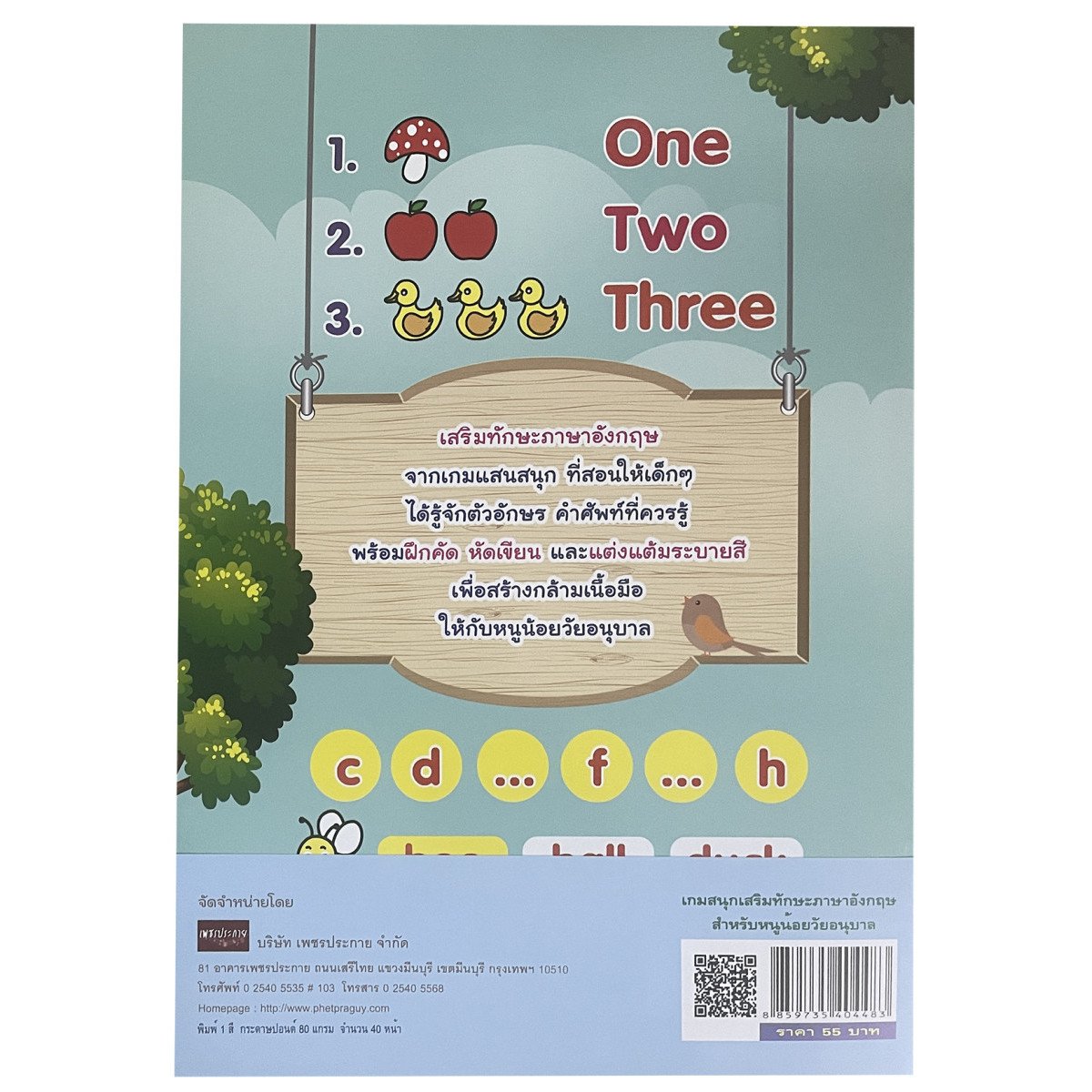 เสริมทักษะภาษาอังกฤษ จากเกม-กิจกรรม สุดสนุกที่หลากหลาย เช่น ระบายสี โยงเส้นจับคู่ และเติมตัวอักษรที่ขาดหาย เด็กๆ จะได้รู้จักตัวอักษร คำศัพท์ A-Z สนุกไปพร้อมกับการเสริมทักษะเชาวน์ปัญญาเพื่อการต่อยอดทางด้านภาษาอังกฤษในอนาคต เหมาะสำหรับวัยอนุบาล