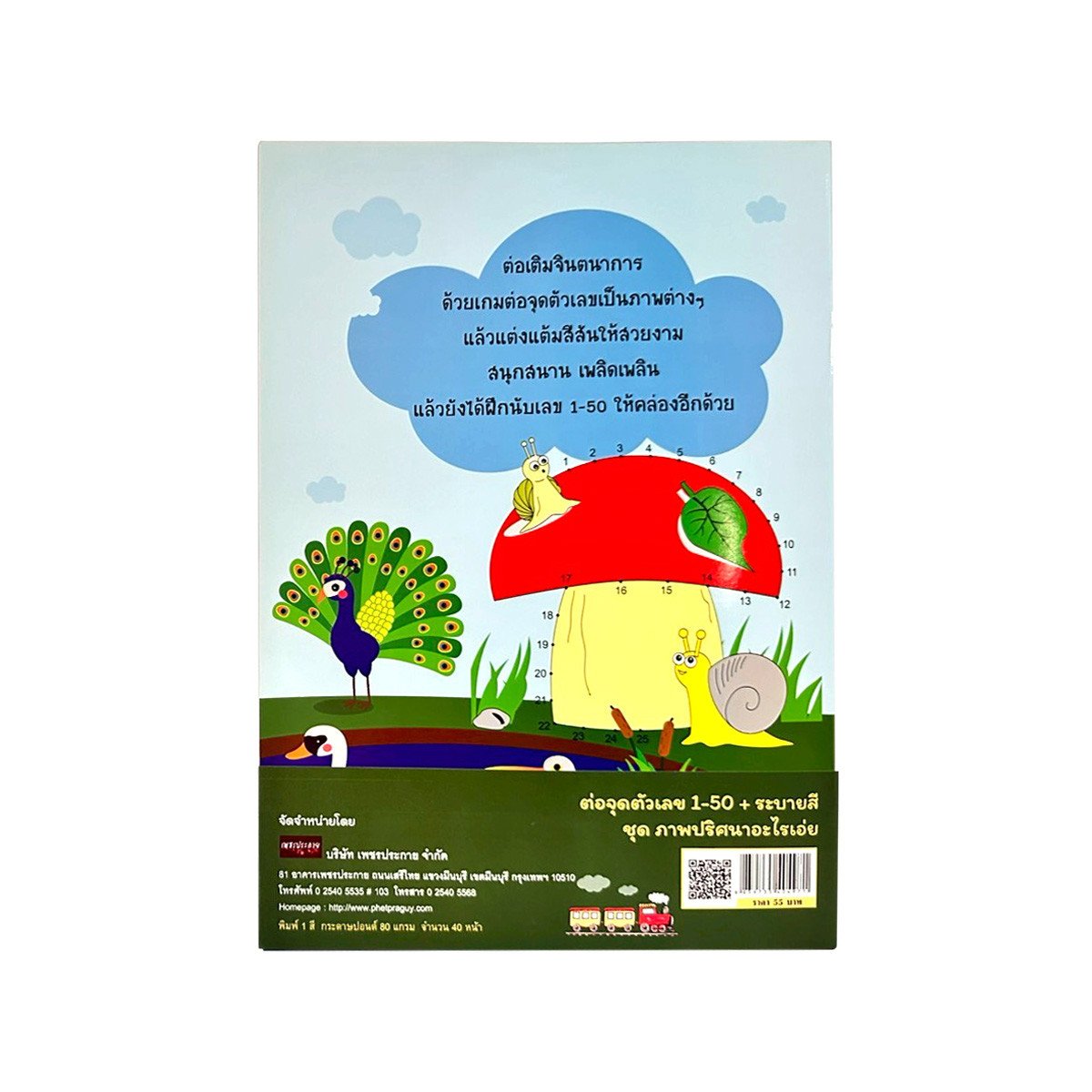 หนังสือเล่มนี้จะชวนน้อง ๆ มาต่อจุดตัวเลขเป็นภาพต่าง ๆ แล้วแต่งแต้มสีสันให้สวยงาม นอกจากได้ความสนุกสนานแล้ว ยังได้ฝึกนับเลข 1-50 ให้คล่องอีกด้วย